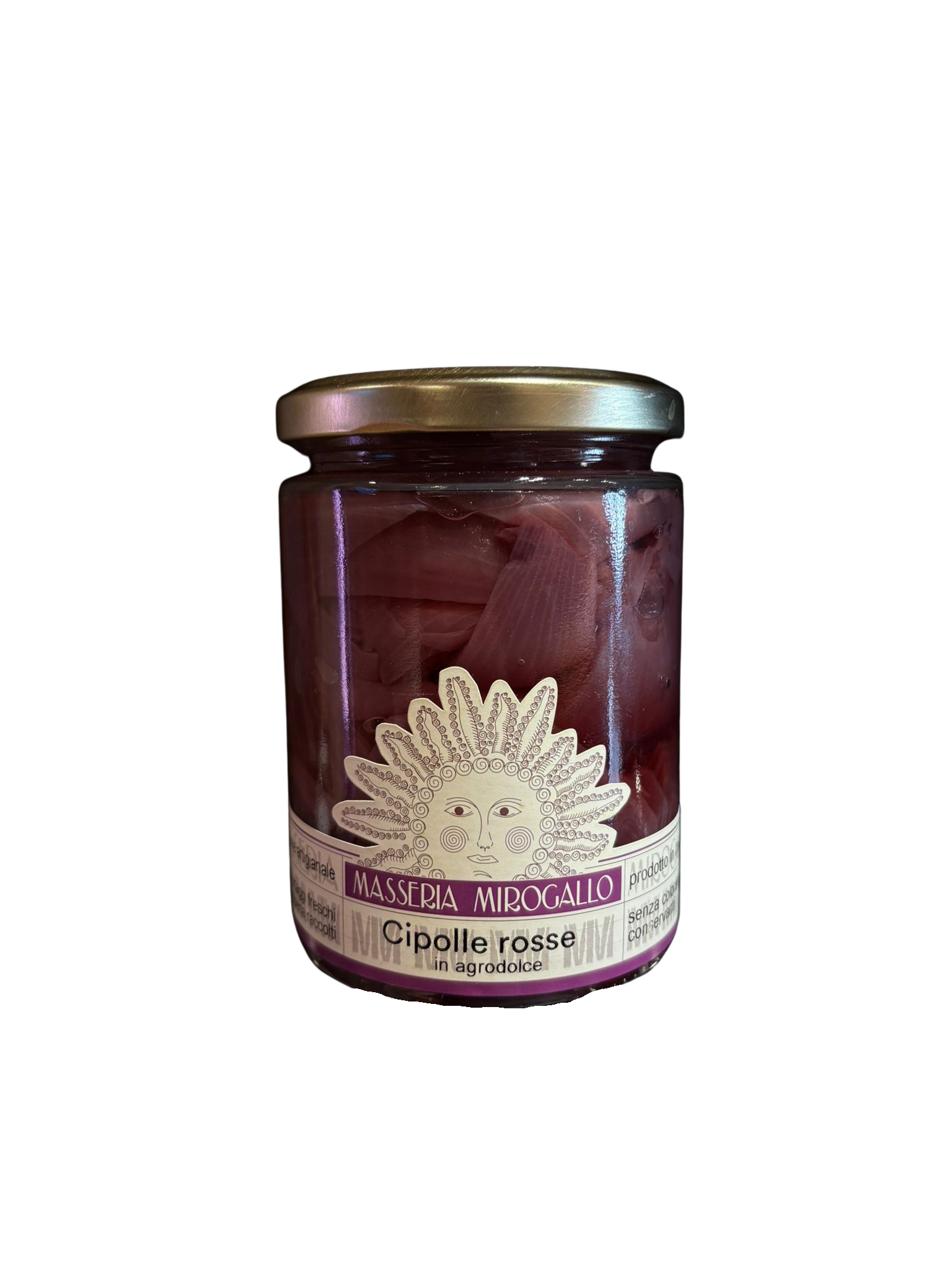 Cipolle rosse selezionate, tagliate e scottate delicatamente, per poi maturare in una concia agrodolce a base di aceto di vino, zucchero e sale.