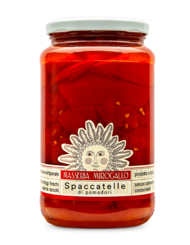 Pomodori coltivati sotto il sole della Basilicata, raccolti al giusto punto di maturazione e tagliati “a spaccatella”, cioè a metà, come da tradizione contadina.